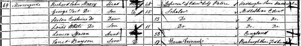 At this point his health failed – he had refused to delegate any work and was effectively carrying out two jobs – that of the superintendent and that of the prosecutor, staying up all night preparing papers. The police committee was sympathetic but at a loss on how to remedy the situation. Eventually, he succumbed to exhaustion and had to take a leave of absence. The immediate appointment of Thomas Linton as Lieutenant of police can have done little to improve his health such was his insistence at having no deputy. According to the 1851 Census he lived in 69 Morningside with his children George, Helen and Louis along with an aunt Louisa Mason and a servant Janet Bryson.