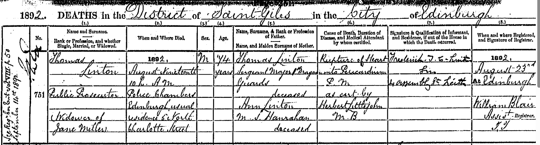 Thomas Linton died on the 19th of August 1892 aged 74 in the Police Chambers High Street Edinburgh of a heart attack. His death was registered by his son Frederick of 4 Assembly Street Leith.