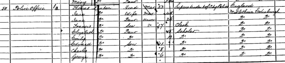Thomas Linton was born in England in 1818 and joined the police force early in life and rising through the ranks to become Chief Superintendent in April 1851 after the death of Richard Moxey that year. He married Jane Miller, and his daughter Annie Linton was born in 1852, the first of 7 children. He employed a servant from Caithness. (See Thomas Linton (born 1818) living in Newington, Midlothian in 1881)