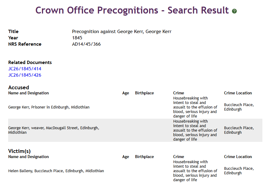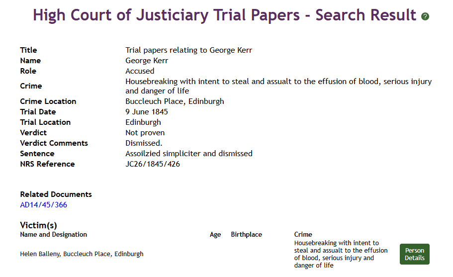 From some peculiar choice, it would seem, and not from necessity, she kept no regular servant, employing a woman to come occasionally, and do any duties she could not herself perform; nor is it thought she had any extreme penuriousness in her nature, that led to this choice; rather, it would seem that she preferred being alone, having discovered perhaps that the Edinburgh servants are not remarkable for either fidelity or affection towards their employers. It is certain, at least, she was an inoffensive lady, and in many respects amiable and kindly in her feelings.! One night, in February 1845, she was preparing to retire to rest, it being near ten o’clock,—seriously disposed, she had been reading her Bible, and engaged in those thoughts that become one of her years. It has often been remarked, as a strange fact in the economy of nature, that the nearer to a catastrophe, the further the thoughts from it—a kind of security into which we are lulled by a false quietude, betokening a continuance of that peace which we could have wished to be un- broken, and which at least might be expected by those who desire to be in friendship with all men. She was startled in the midst of her lonely musings by a noise, as if some one was endeavouring to force an entry through one of the windows of the lower or area flat. Greatly fluttered, she groped her way to the lobby, which ran from the front area-door to the back, and before she got half-way along it, she encountered a man. Giving a suppressed choking scream, she retreated towards the kitchen, where, being followed by the man, he seized a heavy poker, and struck her a terrible blow on the head.